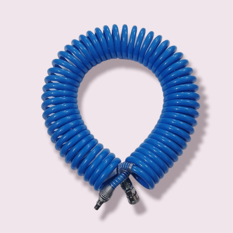 شلنگ فنری، ابزاری جهت انتقال هوای فشرده است. شلنگهای فنری (شلنگ فنری، ابزاری جهت انتقال هوای فشرده است. شلنگهای فنری (تلفنی) بر اساس متراژشان دسته بندی میشود تا در صنایع مختلف با توجه به نیاز استفاده شود.« این شلنگ فنری دارای 5 متر طول است. جنس این شلنگ از مواد اولیه پلی یورتان (PU) هست. این جنس قابلیت انعطاف بالا و دارای مقاومت بالا در مقابل خراشیدگیها از قبیل ساییده شدن شلنگ بر روی زمین و غیره است. همچنین این مواد مقاومتش در برابر گرما و سرما بالا بوده و باعث افزایش عمر شلنگ فنری نیز میشود. قطر داخلی این شلنگ فنری 8 میلیمتر و قطر خارجی آن 12 میلیمتر است تا ضخامت استاندارد این شلنگ به کاربر اطمینان خاطر بابت ایمنی استفاده از این ابزار را بدهد. حداکثر فشار قابل تحمل این شلنگ30 بار است که بسیار فراتر از استانداردهای بین المللی است. به علت استفاده 100 درصدی از مواد پلی اورتان، این شلنگ فنری به هیچ عنوان خاصیت فنری خود را از دست نمیدهد و از حالت فنری بودن خود خارج نمیشود. در انتهای این شلنگ یه عدد کوپلینگ اتصال با کیفیت و در سر دیگر این شلنگ یک عدد دنباله اتصال نصب شده تا براحتی بتوان از این ابزار استفاده نمود. همچنین در قسمت اتصال این کوپلینگها و دنبالهها نیر از فنر مقاوم و قابل انعطاف استفاده شده تا از هرگونه آسیب در این قسمت جلوگیری شود و استقامت شلنگ افزایش یابد. این شلنگ فنری بر اساس انواع استاندارهای CE, GS, TUV, IAF, ISO9001:2000 سا خته شده است تا به کاربر اطمینان خاطر از بابت خرید کالایی با کیفیت را دهد.